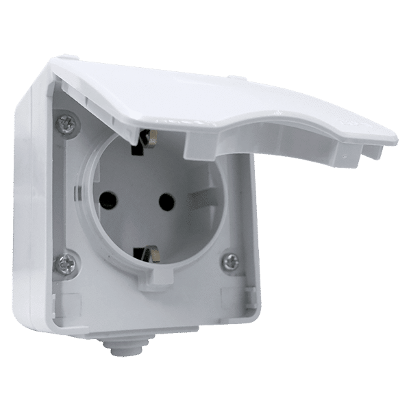 Ανθεκτική πρίζα σούκο της Elmark με βαθμό προστασίας IP65, κατάλληλη για εξωτερικούς χώρους ή βιομηχανική χρήση. Προσφέρει προστασία από νερό και σκόνη, με στιβαρή επιτοίχια κατασκευή και γκρι φινίρισμα για διακριτική ενσωμάτωση σε κάθε περιβάλλον.